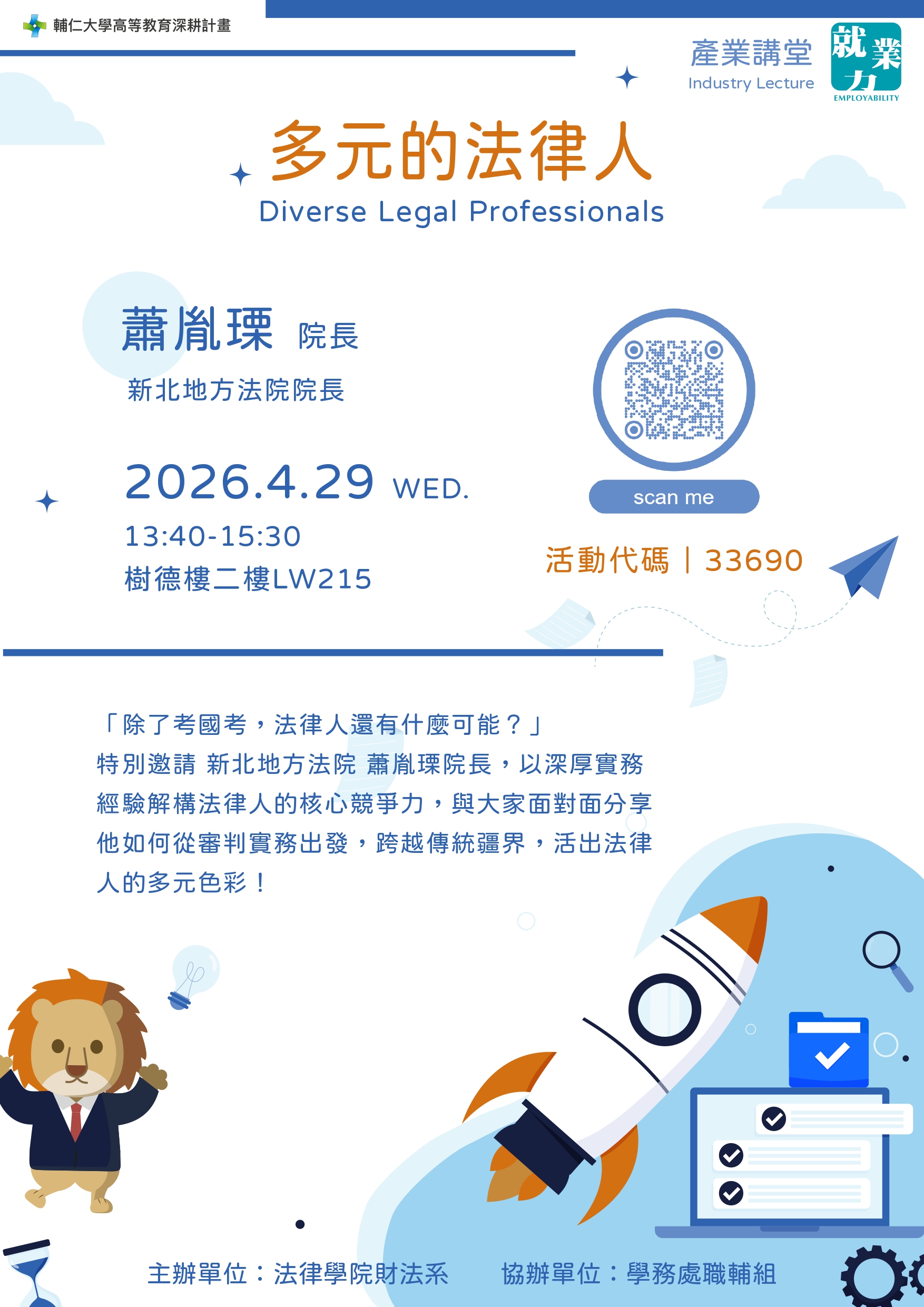 「除了考國考,法律人還有什麼可能?」 特別邀請 新北地方法院 蕭胤瑮院長,以深厚實務經驗解構法律人的核心競爭力,與大家面對面分享他如何從審判實務出發,跨越傳統疆界,活出法律人的多元色彩! 講題: 多元的法律人 時間: 2026年4月29日(三) 13:40-15:30 地點: LW215 法律學院學生全程參加本次活動者,可登錄學生學習護照認證乙次(項目:L-8)