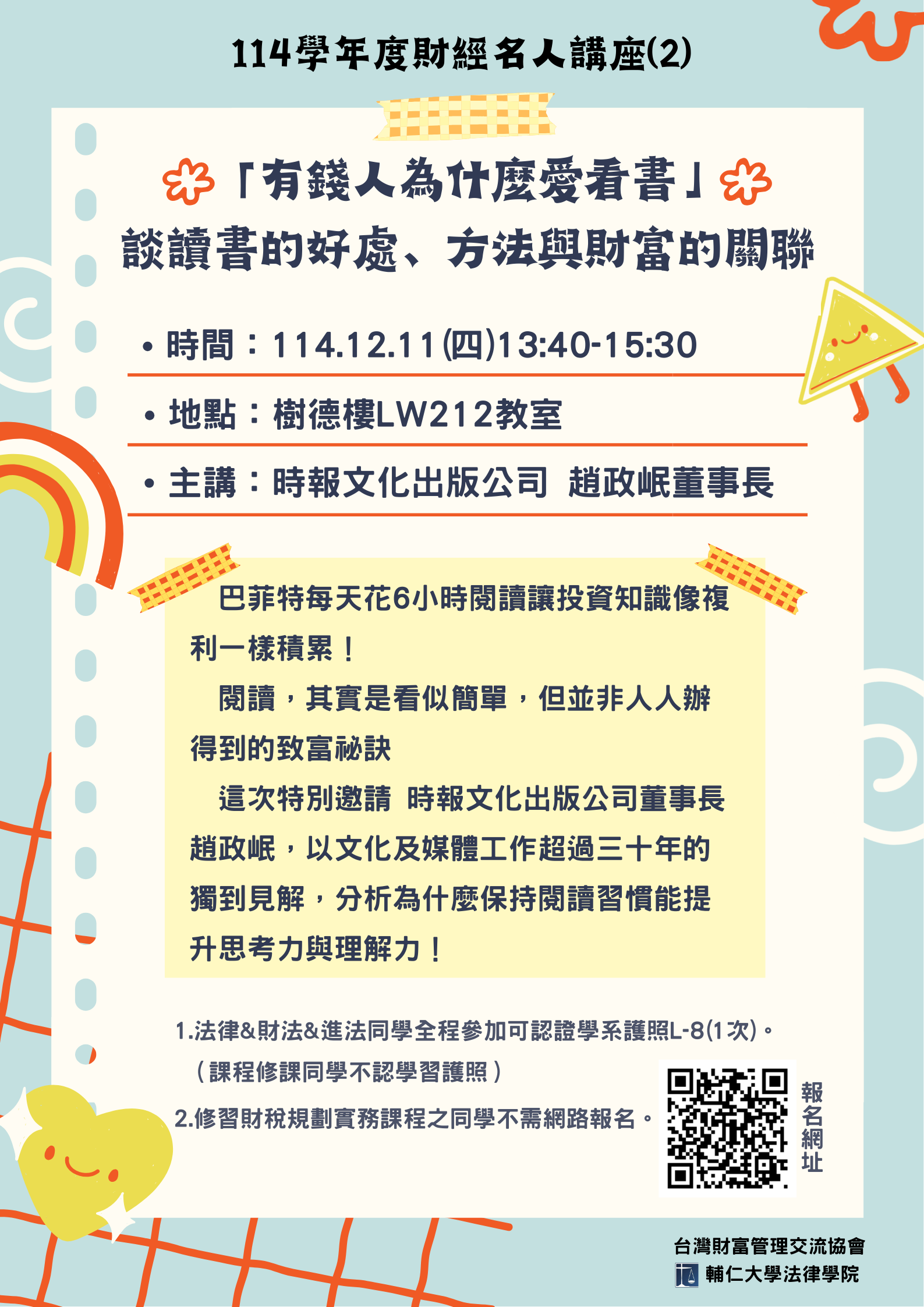 【活動報名】114學年度財經名人講座(2) :「有錢人為什麼愛看書」:談讀書的好處、方法與財富的關聯
